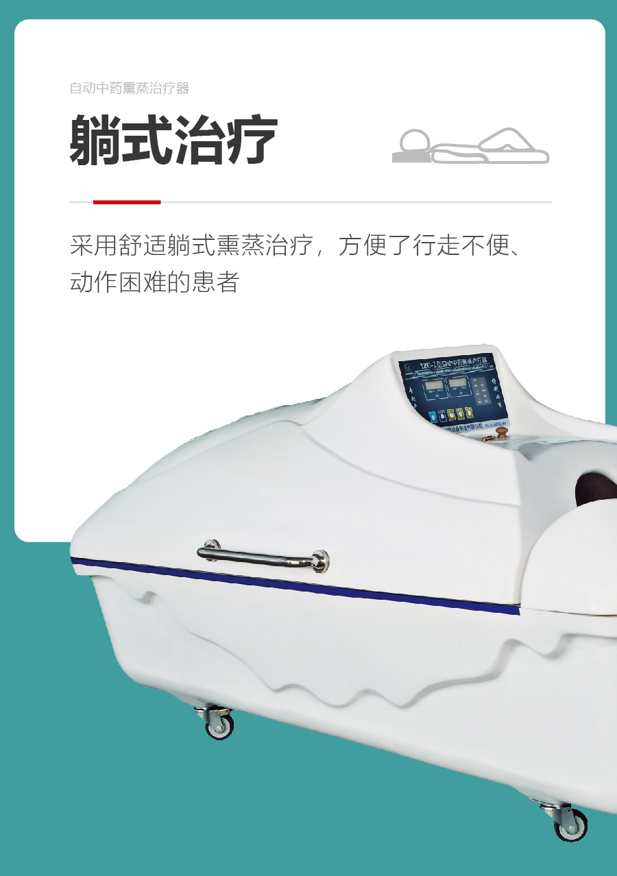 YZC-I型為躺式中藥熏蒸器,是通過熏蒸給藥的方法,有熱和藥的作用.藥汽中的有效成份直接接觸肌膚,粘膜部位,使局部血管擴張促進血液和淋巴液的循環,改善周圍組織的......