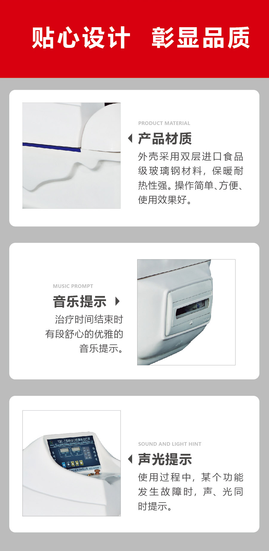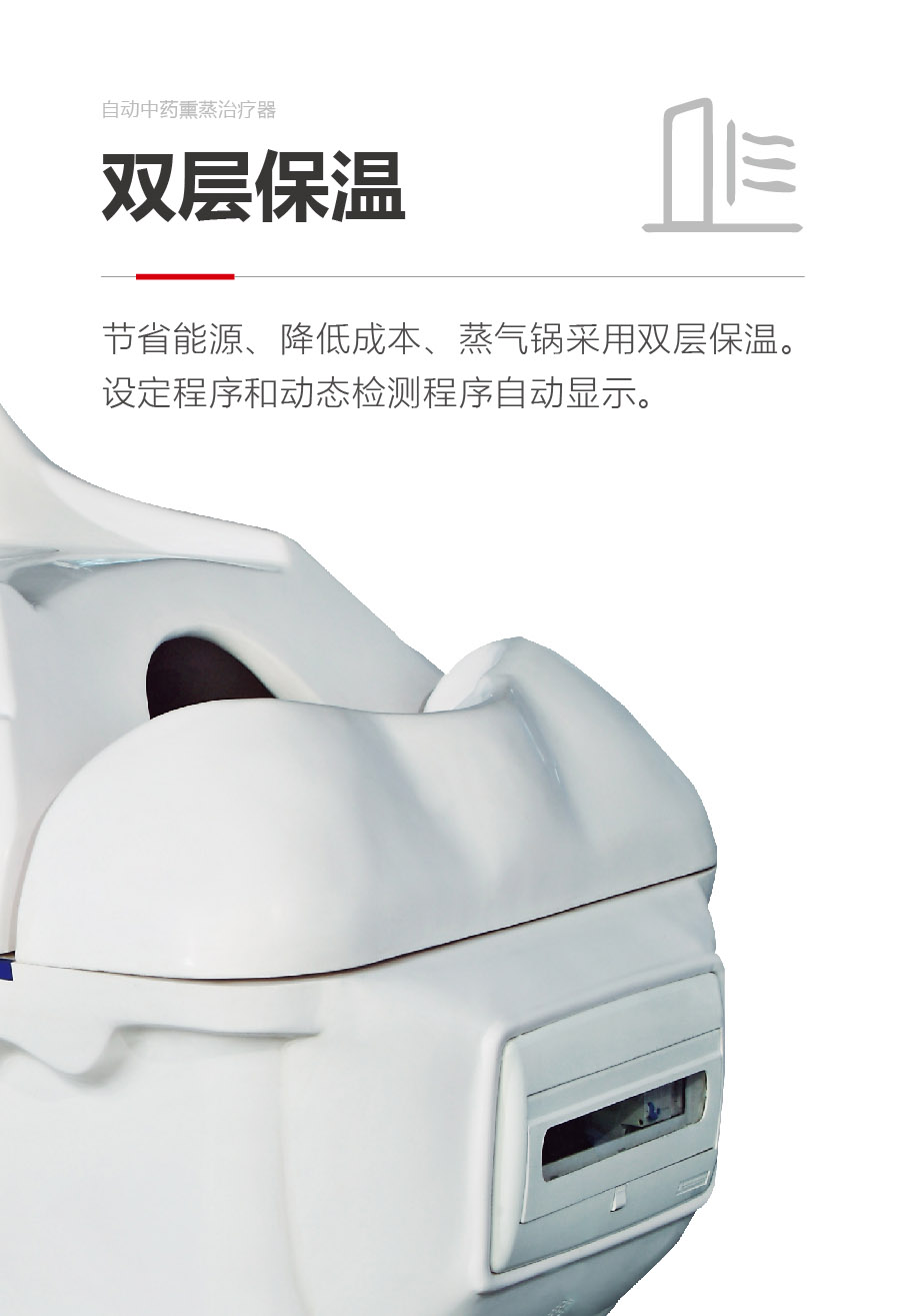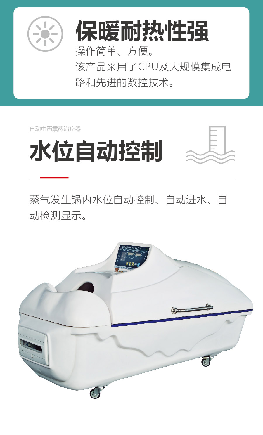 該產品采用了CPU及大規模集成電路和先進的數控技術.研制開發出了新一代電腦型自動中藥熏蒸器,應用電腦高智能的控制軟件,外殼采用雙層進口食品級玻璃鋼材料,保暖耐熱性強。操作簡單、方便、使用效果好。