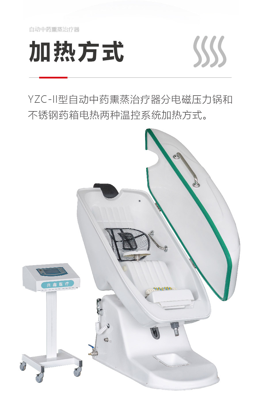 YZC-II型自動中藥熏蒸治療器分電磁壓力鍋和不銹鋼藥箱電熱兩種溫控系統加熱方式。(電磁壓力鍋方式適用于用戶無地漏環境的使用布置,不銹鋼藥箱電熱方式適用于用戶有地漏環境的使用布置。)該機采用中藥放置藥鍋或藥箱內加熱產生藥氣,使氣體中產生藥物離子,使全身皮膚、穴位吸收滲透,開放毛細管網、改善微循環、松弛骨骼、鎮痛、活絡關節。