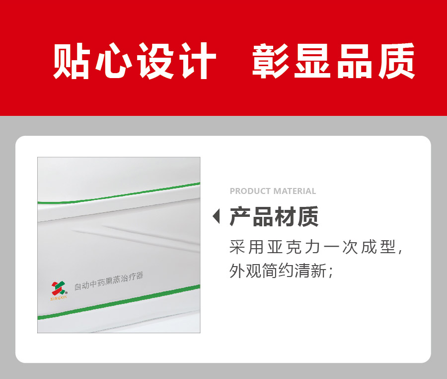 該產(chǎn)品為多部位自動(dòng)中藥熏蒸治療器,在原有的基礎(chǔ)作了改進(jìn),有獨(dú)立三溫區(qū)控制功能。采用進(jìn)口食品級(jí)玻璃鋼床體,造型美觀大方,可單獨(dú)分塊拆分便于維護(hù)。整機(jī)一體化設(shè)計(jì),無......